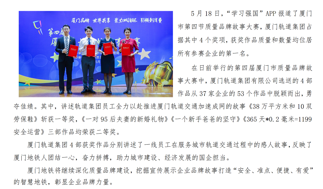 厦门轨道集团多个作品获第四届厦门市质量品牌故事大赛奖项