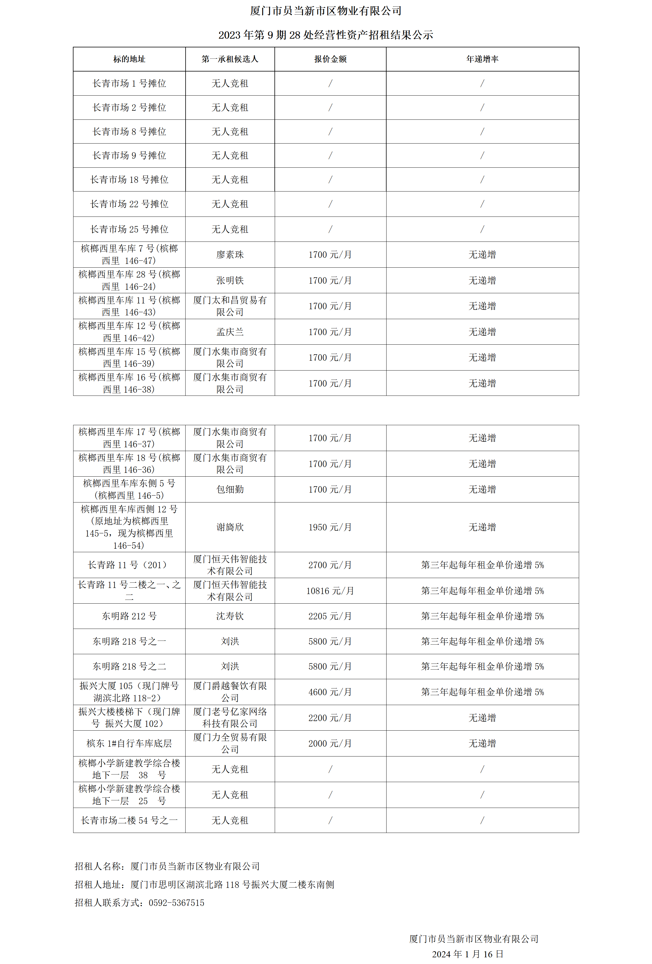 厦门市员当新市区物业有限公司2023年第9期28处经营性资产招租结果公示