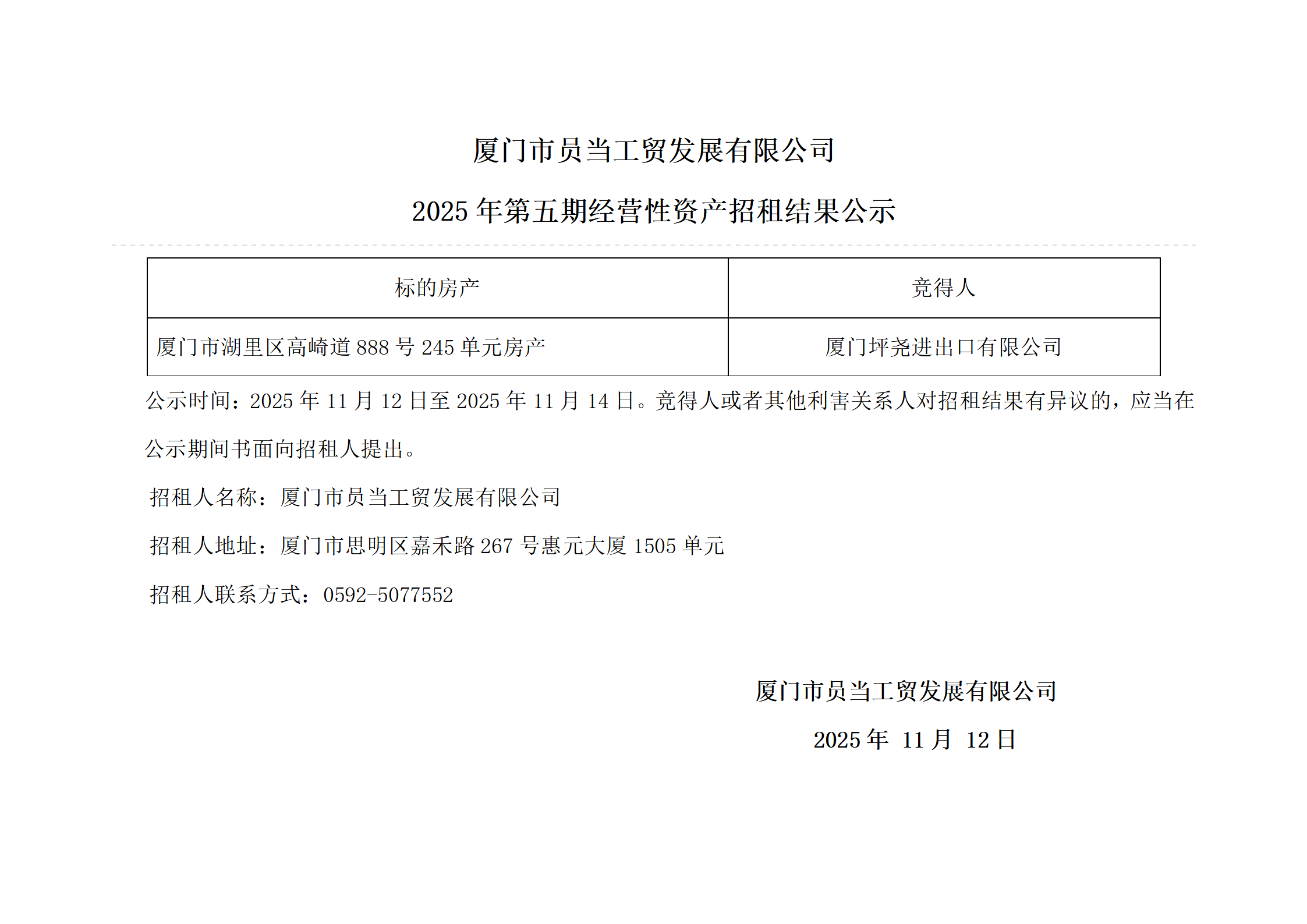 厦门市员当工贸发展有限公司2025年第五期经营性资产招租结果公示