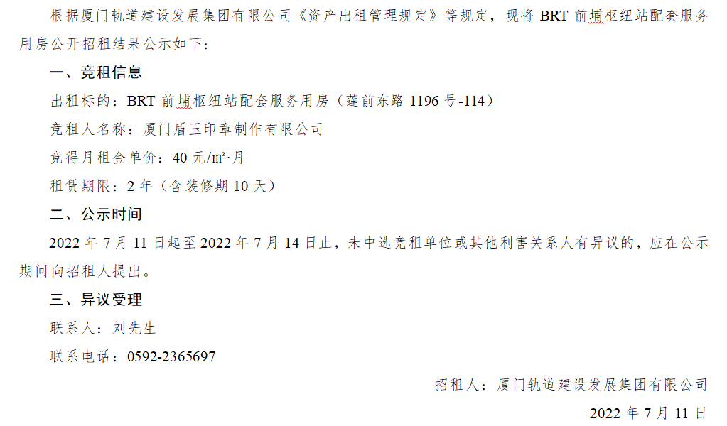 BRT前埔枢纽站配套服务用房公开招租结果公示