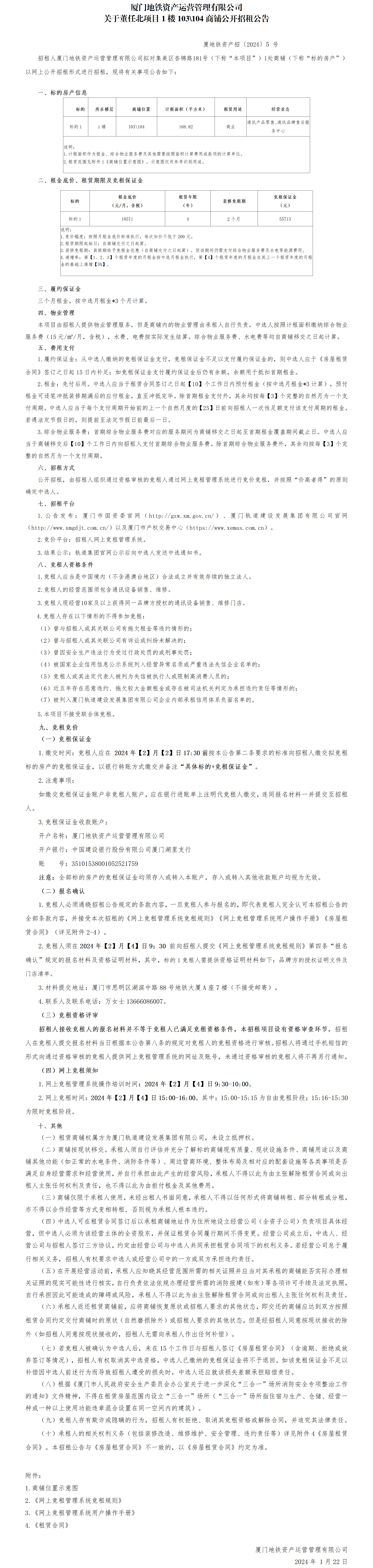 厦门地铁资产运营管理有限公司 关于董任北项目1楼103104商铺公开招租公告