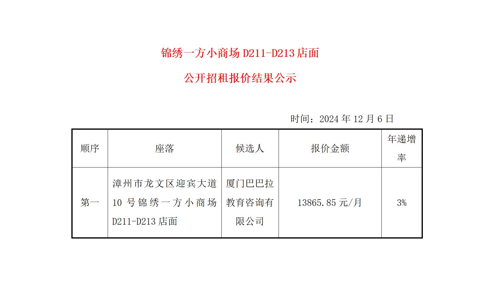 漳特公司锦绣一方小商场D211-213店面招租结果公示