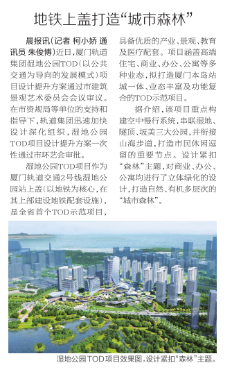 晨报讯(记者 柯小娇 通讯员 朱俊博)近日,厦门轨道集团湿地公园TOD(以公共交通为导向的发展模式)项目设计提升方案通过市建筑景观艺术委员会会议审议。在市资规局等单位的支持和指导下,轨道集团迅速加快设计深化组织,湿地公园TOD项目设计提升方案一次性通过市环艺会审批。