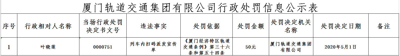 厦门轨道交通集团有限公司行政处罚信息公示(2020.5.6-2020.5.12)