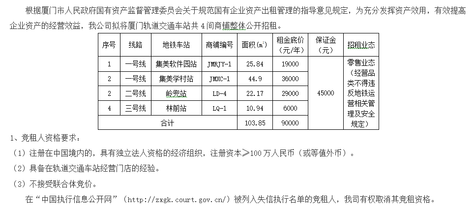 厦门轨道交通车站共4间商铺整体公开招租公告