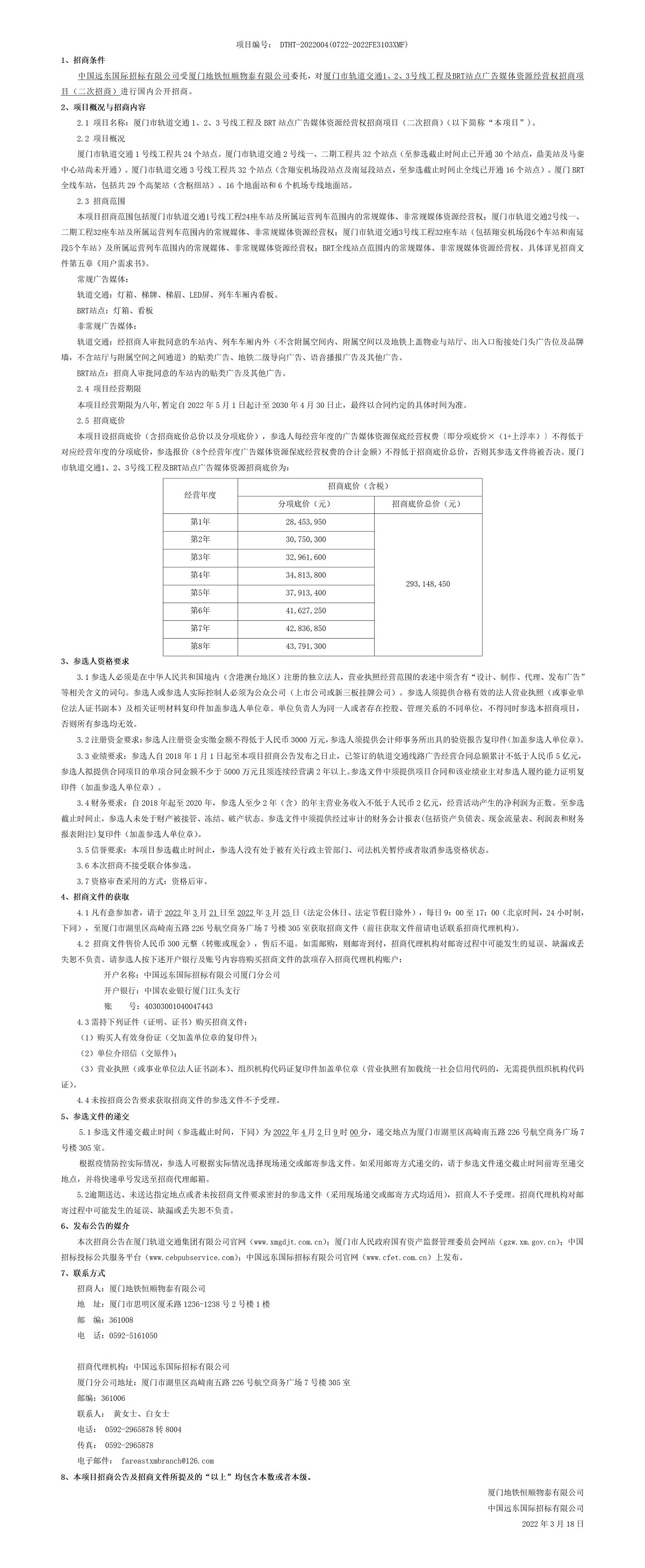 厦门市轨道交通1、2、3号线工程及BRT站点广告媒体资源经营权招商项目(二次招商)招商公告