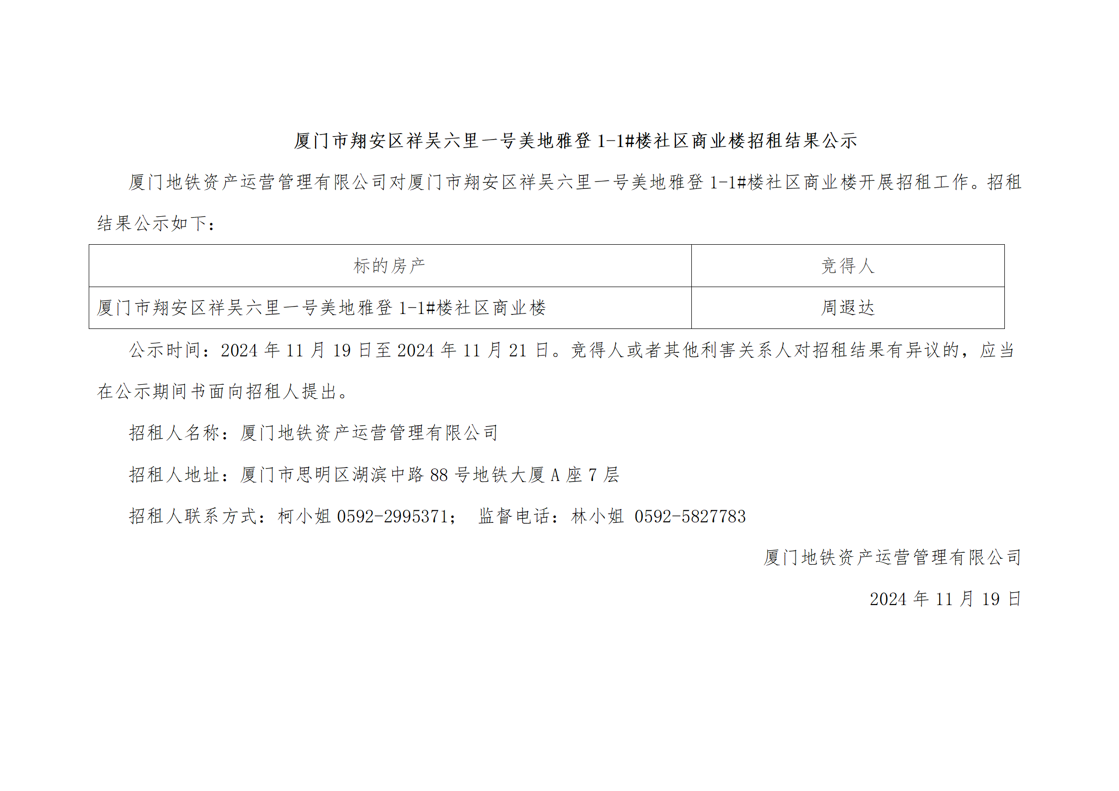 厦门市翔安区祥吴六里一号美地雅登1-1#楼社区商业楼招租结果公示