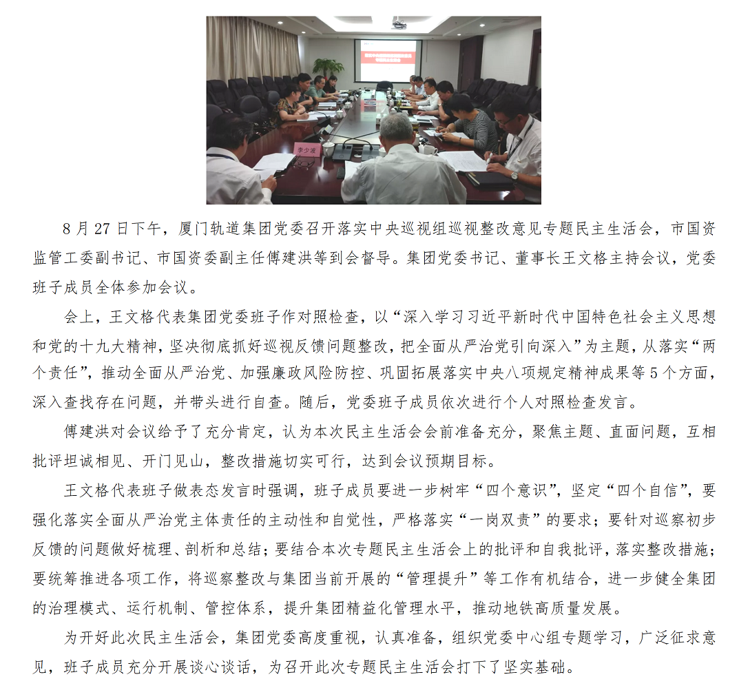 厦门轨道集团党委召开落实中央巡视组巡视整改意见专题民主生活会