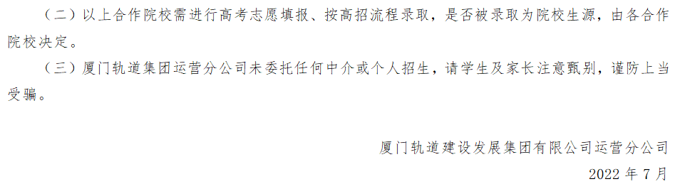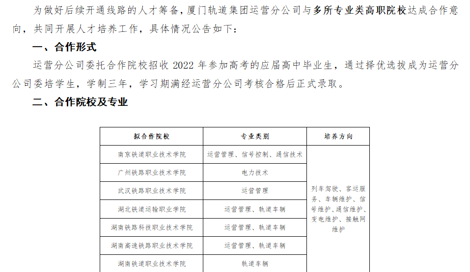 厦门轨道建设发展集团有限公司运营分公司2022年校企合作公告