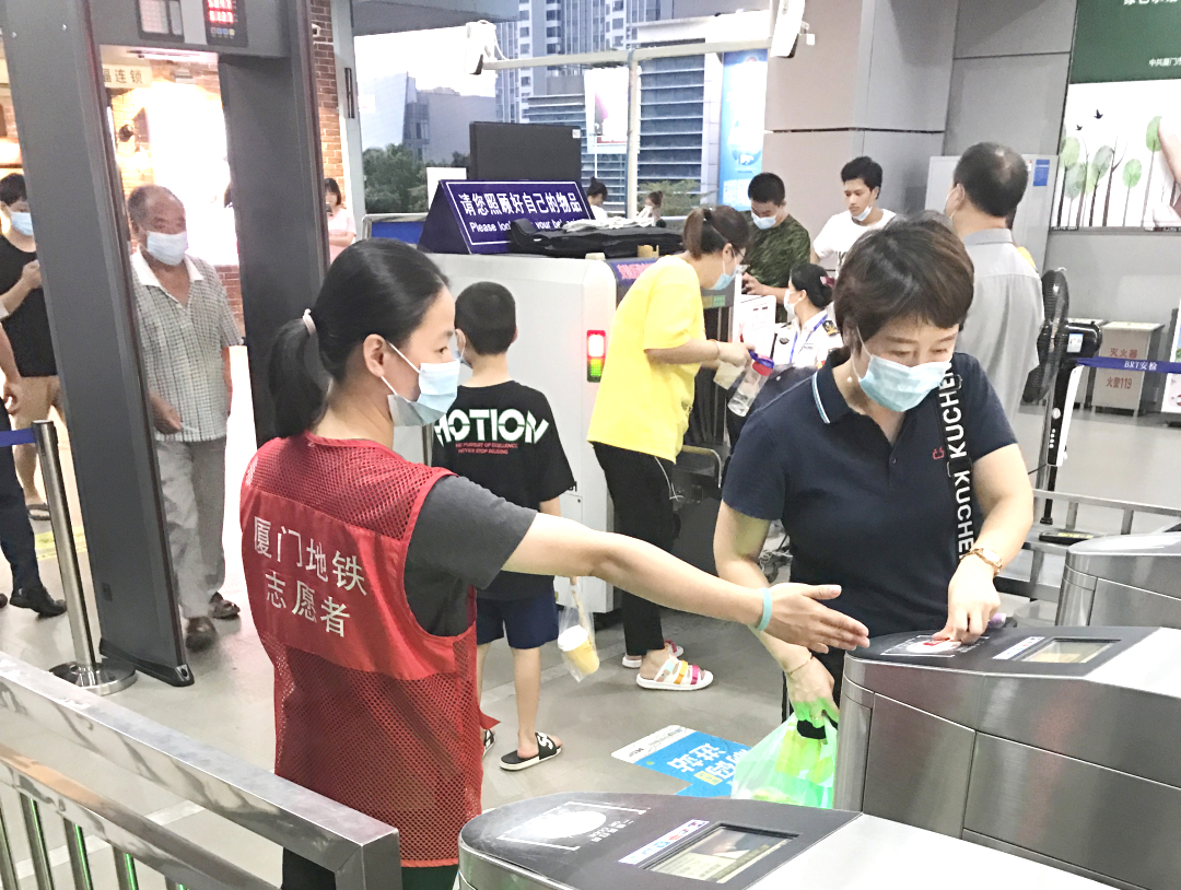 集美线党支部的党员志愿者们在车站宣导正确佩戴口罩、不乱扔垃级、不在公众场合吸烟、有序候车乘车等文明行为,带动更多市民乘客争做创建文明城市的主人公,做文明的传播者、践行者。