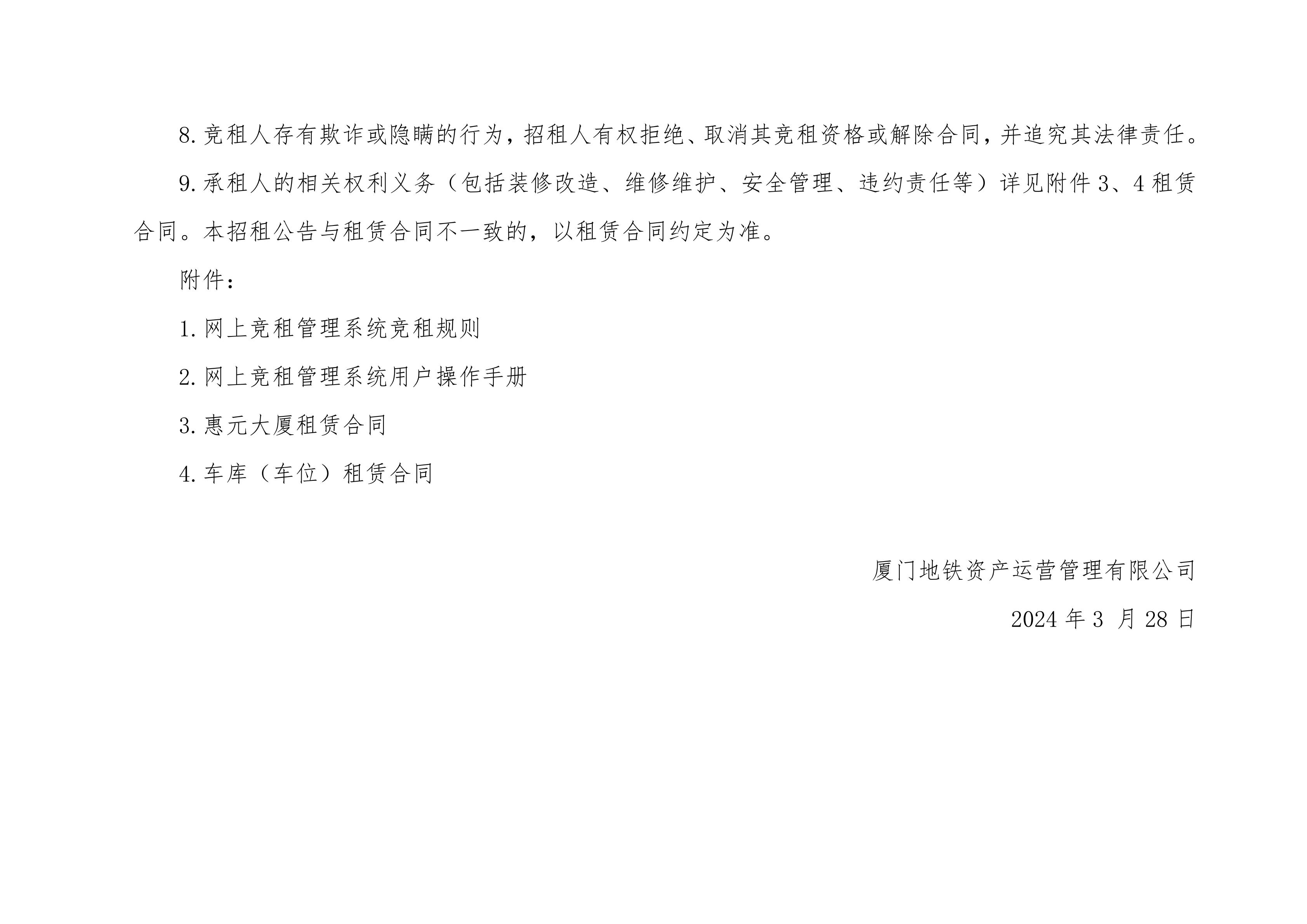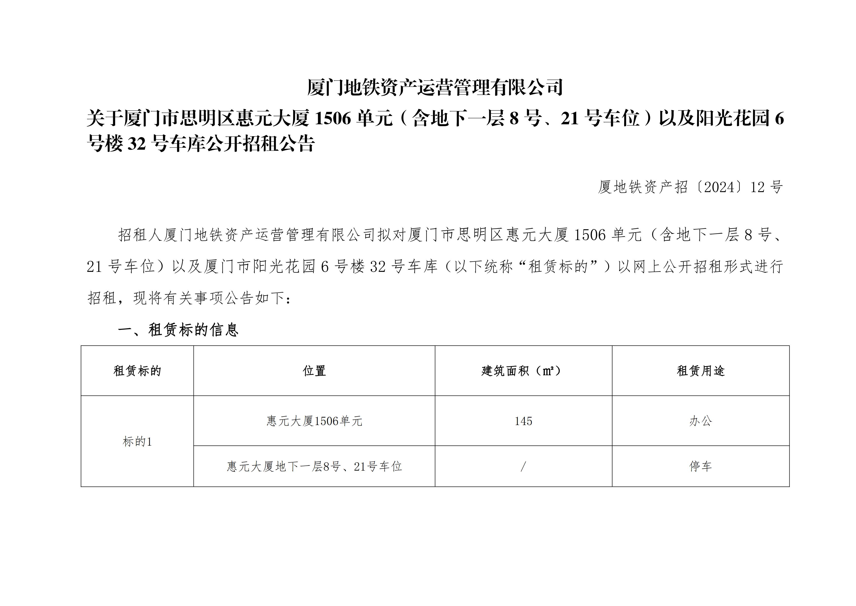 厦门地铁资产运营管理有限公司关于厦门市思明区惠元大厦1506单元(含地下一层8号、21号车位)以及阳光花园6号楼32号车库公开招租公告