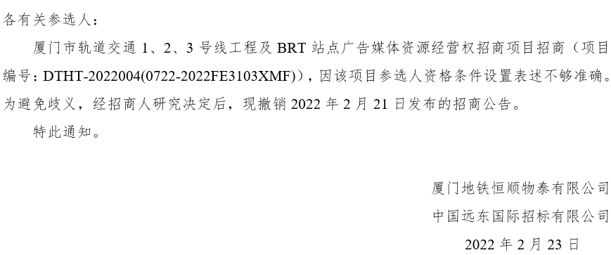 关于撤销厦门市轨道交通1、2、3号线工程及BRT站点广告媒体资源经营权招商项目招商公告的通知