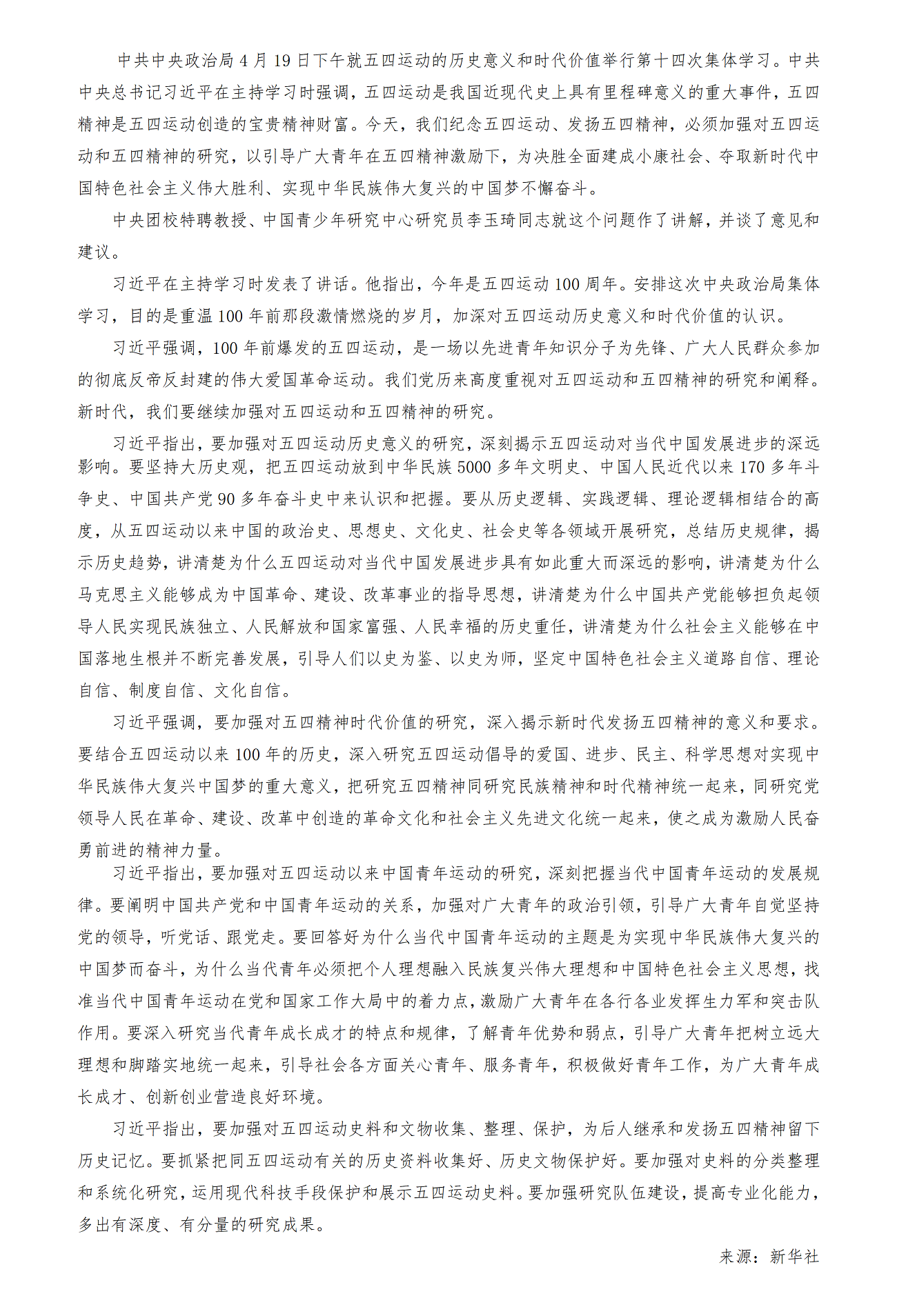 习近平:加强对五四运动和五四精神的研究 激励广大青年为民族复兴不懈奋斗