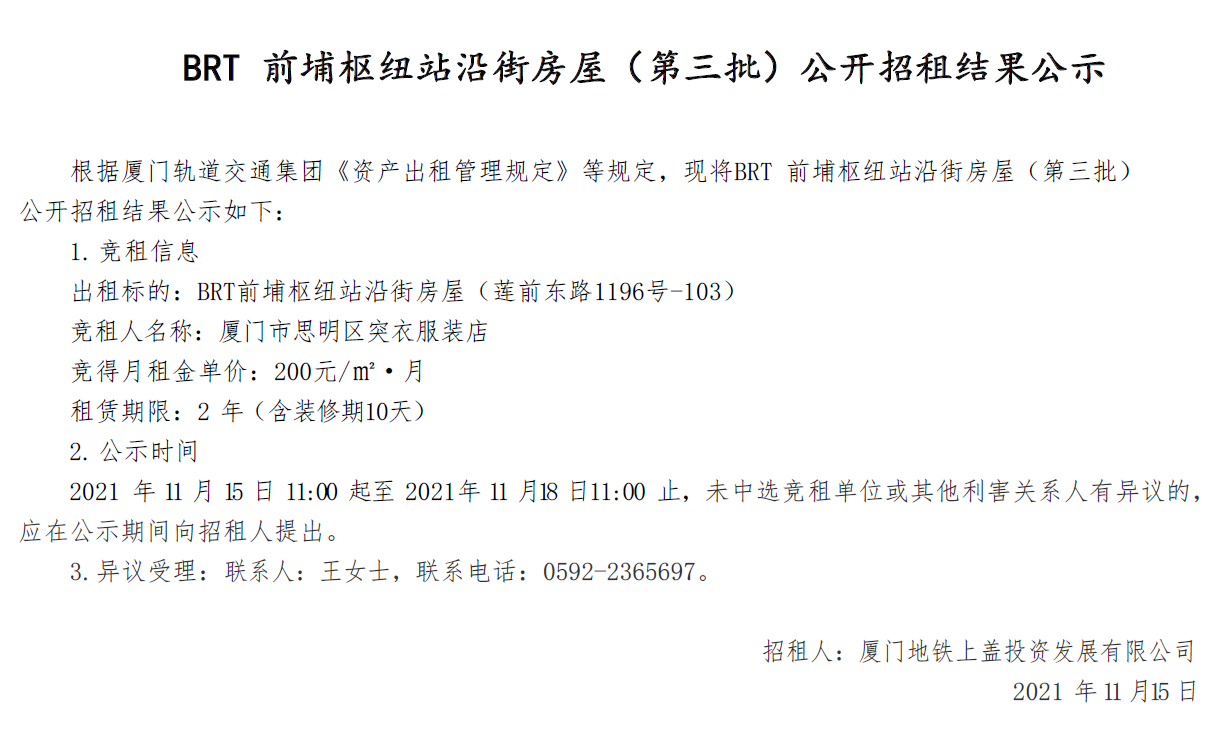 BRT 前埔枢纽站沿街房屋(第三批)公开招租结果公示