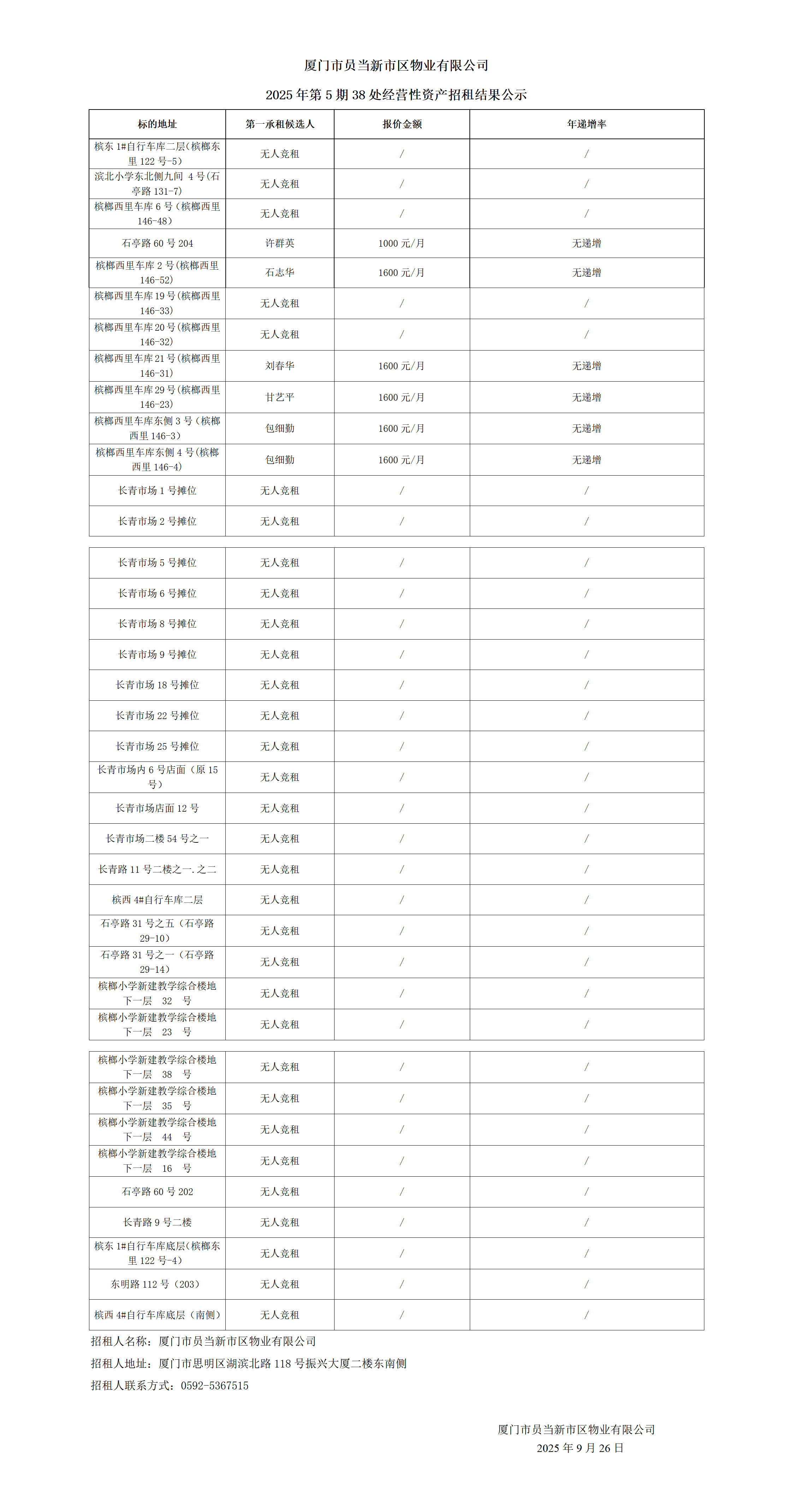 厦门市员当新市区物业有限公司2025年第5期38处经营性资产招租结果公示