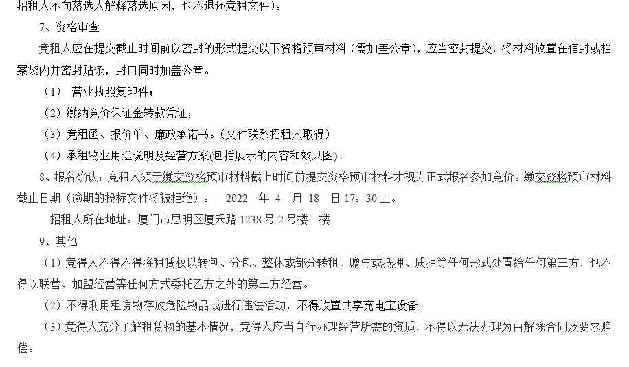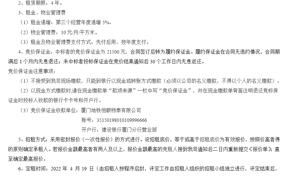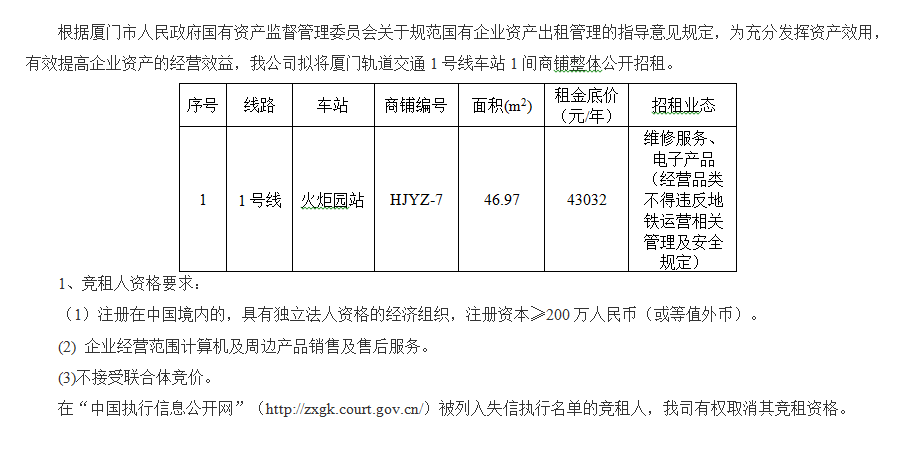 厦门市轨道交通1号线车站1间商铺公开招租公告