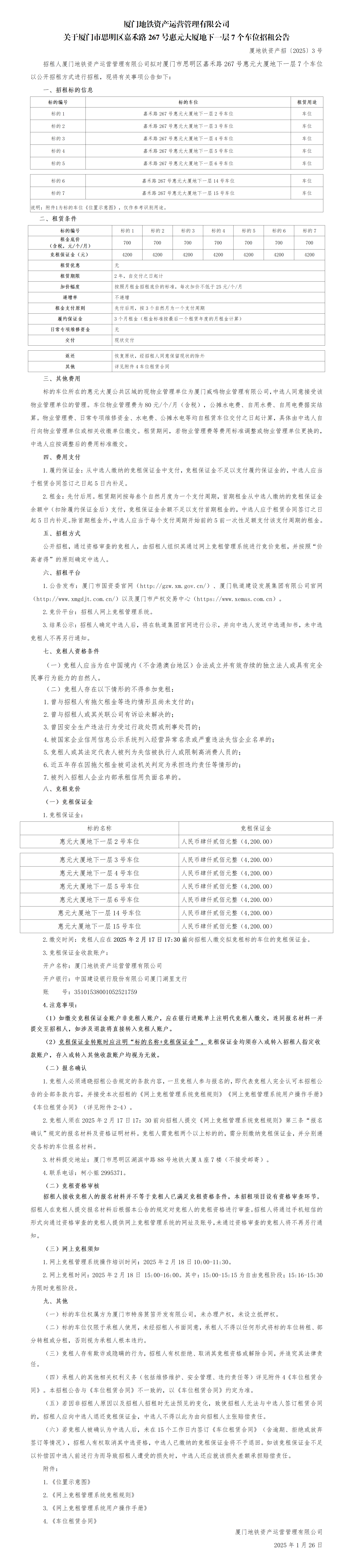 关于厦门市思明区嘉禾路267号惠元大厦地下一层7个车位招租公告