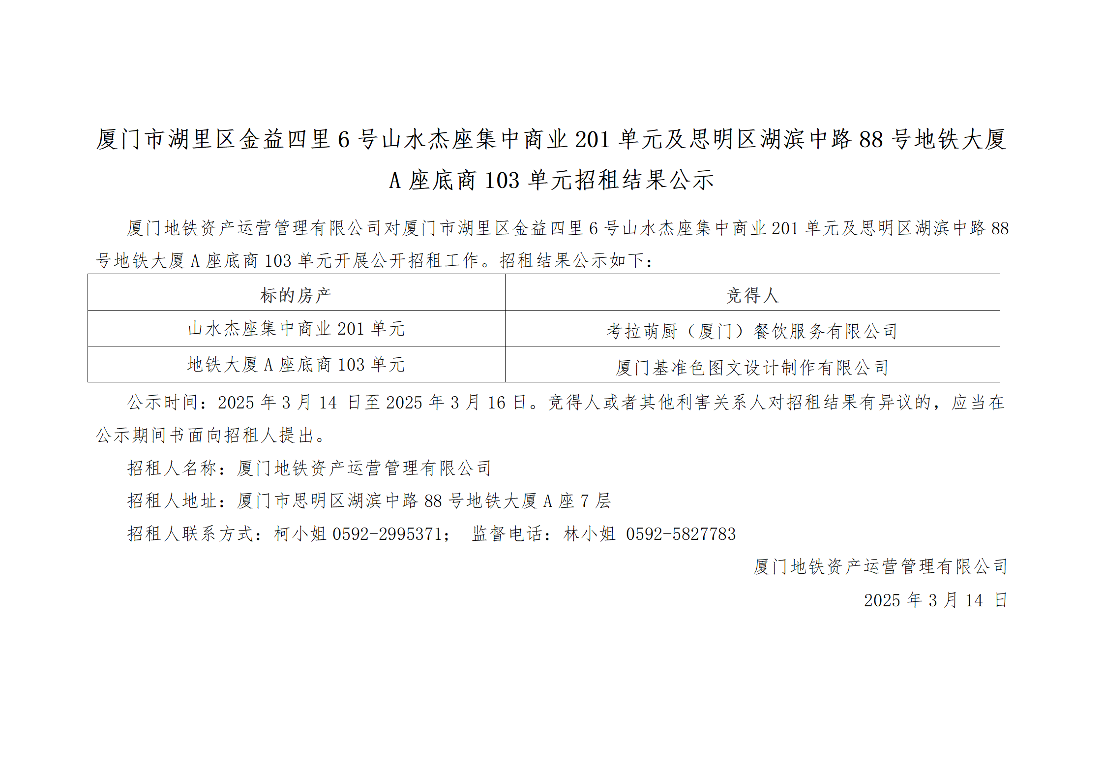 厦门市湖里区金益四里6号山水杰座集中商业201单元及思明区湖滨中路88号地铁大厦A座底商103单元招租结果公示