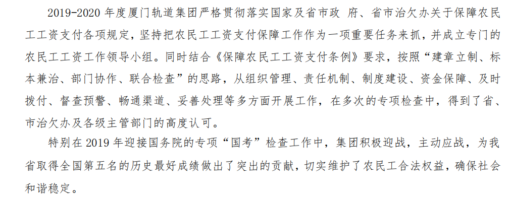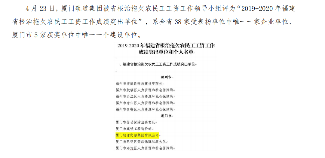 厦门轨道集团被评选为“省根治拖欠农民工工资工作”成绩突出单位
