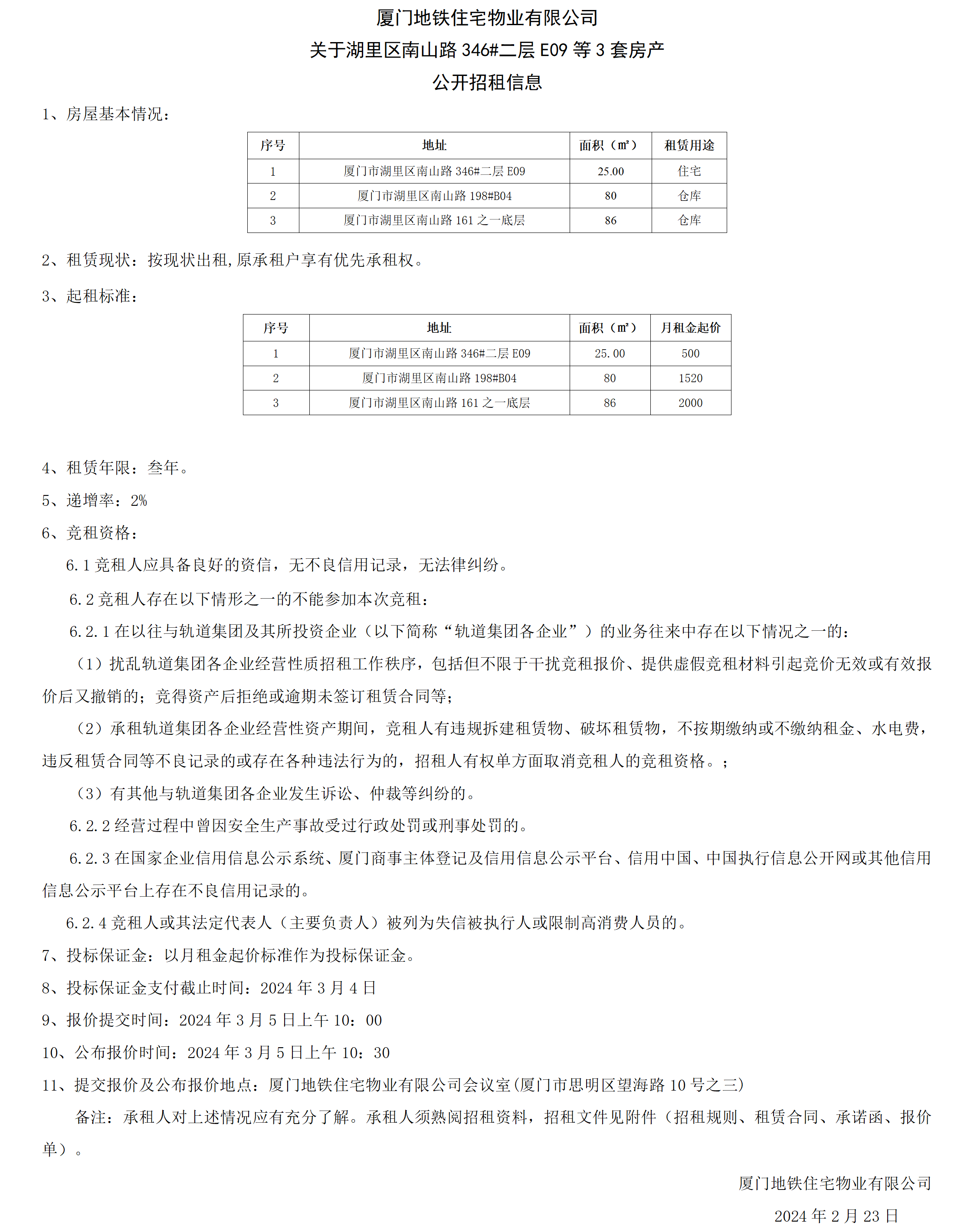 厦门地铁住宅物业有限公司关于湖里区南山路346#二层E09等3套房产 公开招租信息
