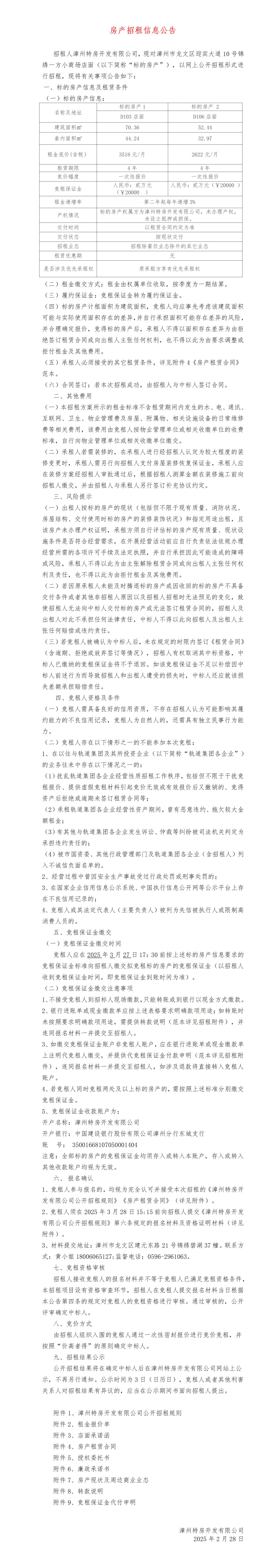 漳州特房开发有限公司房产招租信息公告