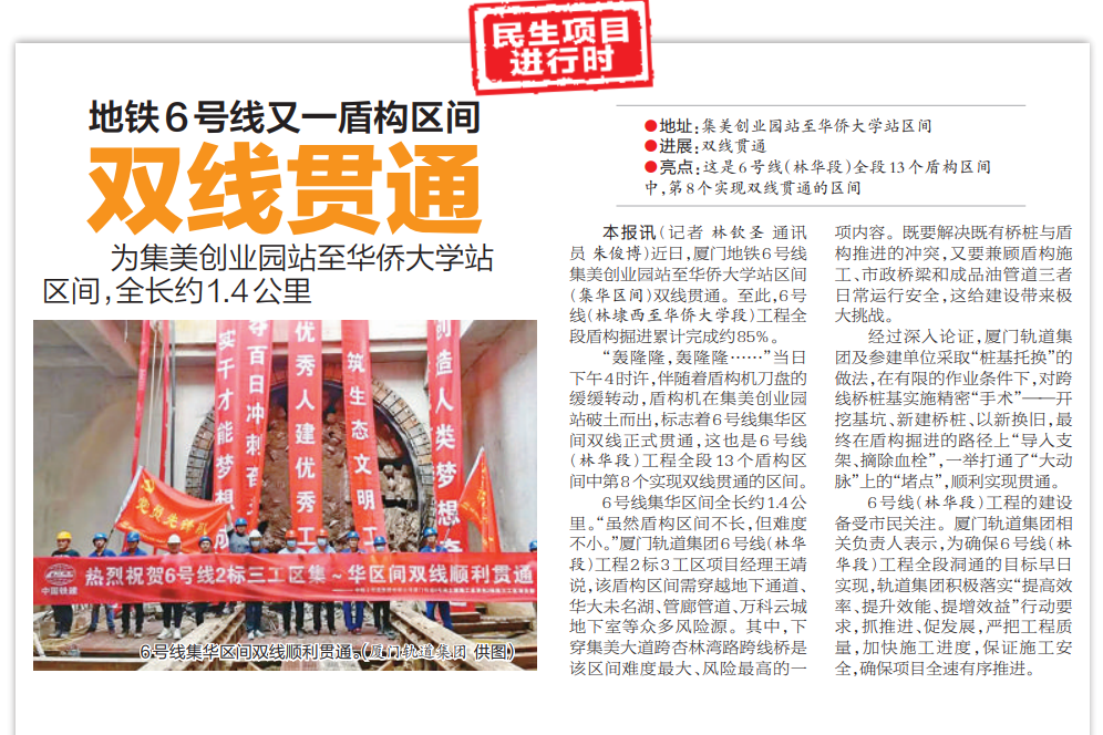 本报讯(记者 林钦圣 通讯员 朱俊博)近日,厦门地铁6号线集美创业园站至华侨大学站区间(集华区间)双线贯通。至此,6号线(林埭西至华侨大学段)工程全段盾构掘进累计完成约85%。