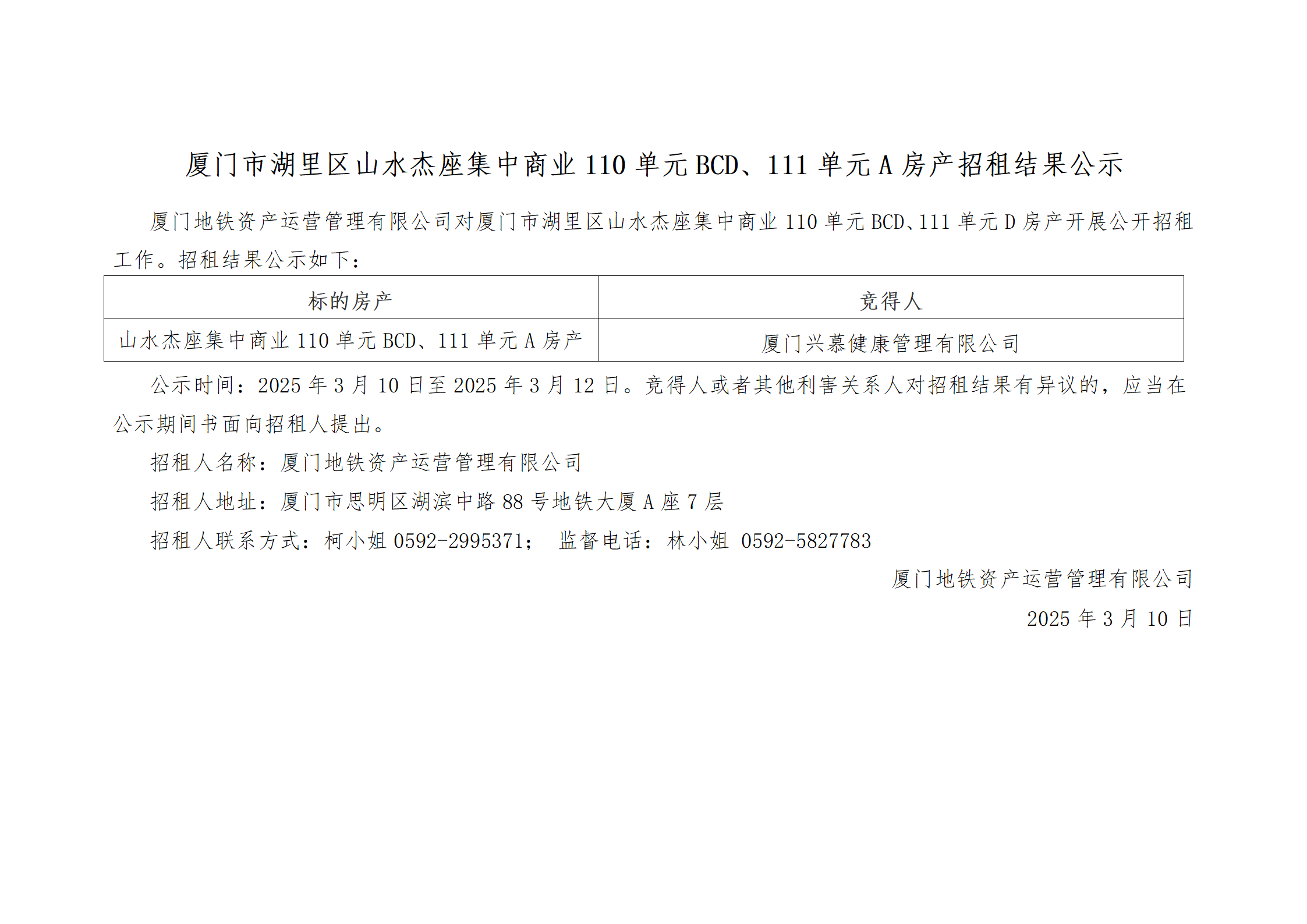 厦门市湖里区山水杰座集中商业110单元BCD、111单元A房产招租结果公示