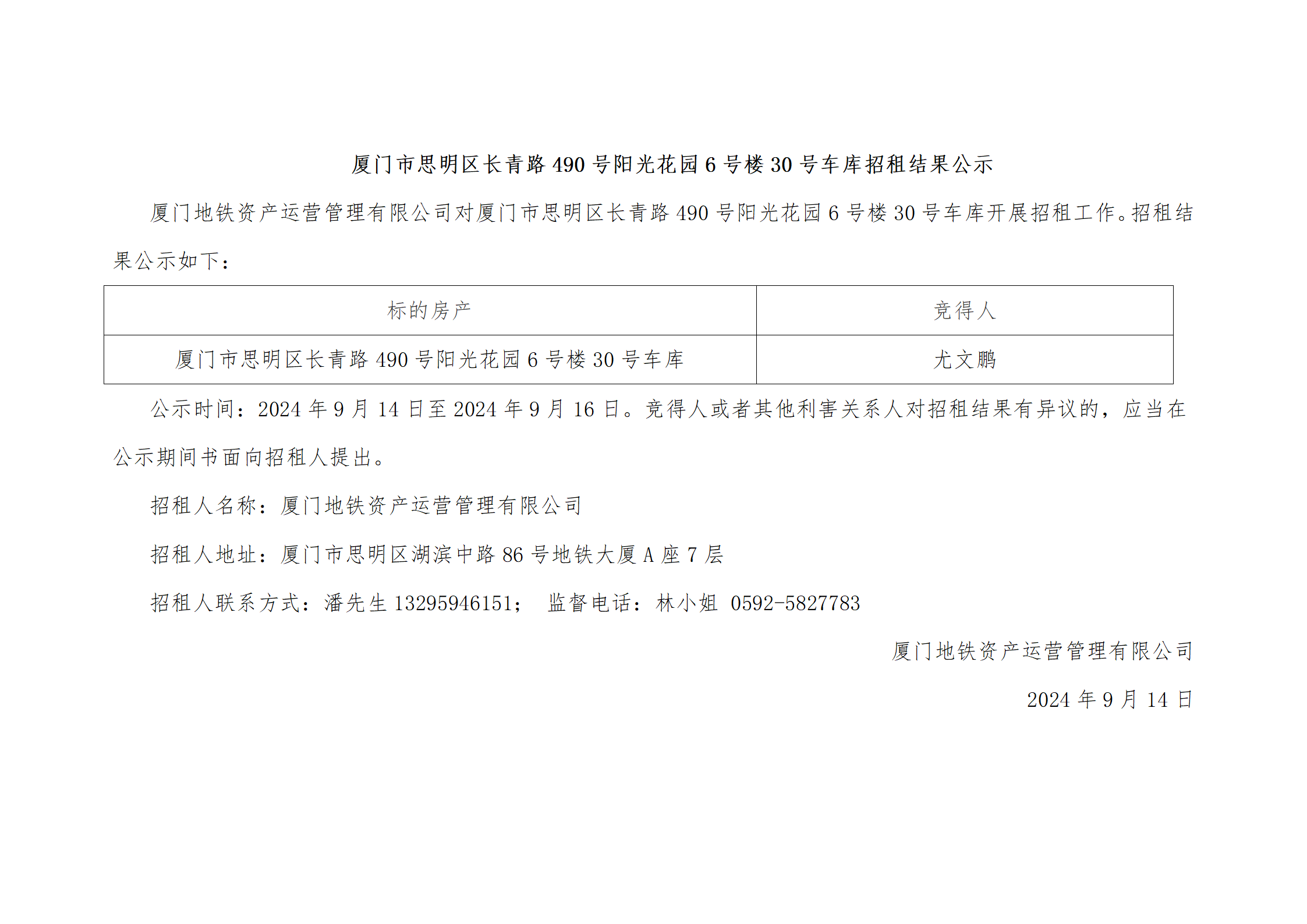 厦门市思明区长青路490号阳光花园6号楼30号车库招租结果公示