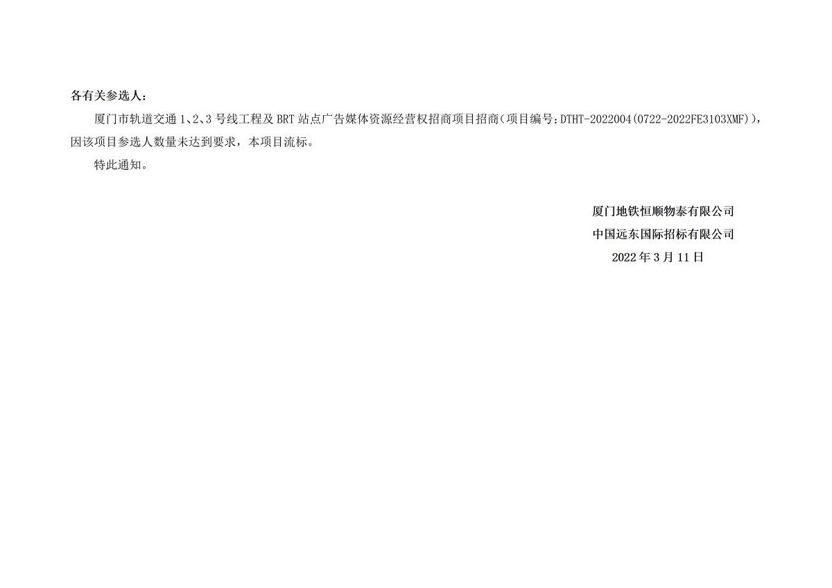关于厦门市轨道交通1、2、3号线工程及BRT站点广告媒体资源经营权招商项目流标的通知