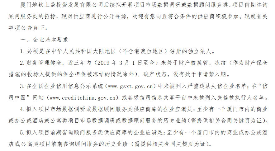 关于项目市场数据调研或数据顾问服务类、项目前期咨询顾问服务类供应商的寻源公告