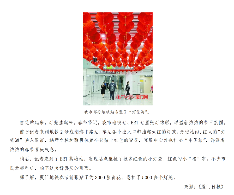 【厦门日报】:地铁站、BRT站,张灯结彩欢迎乘客