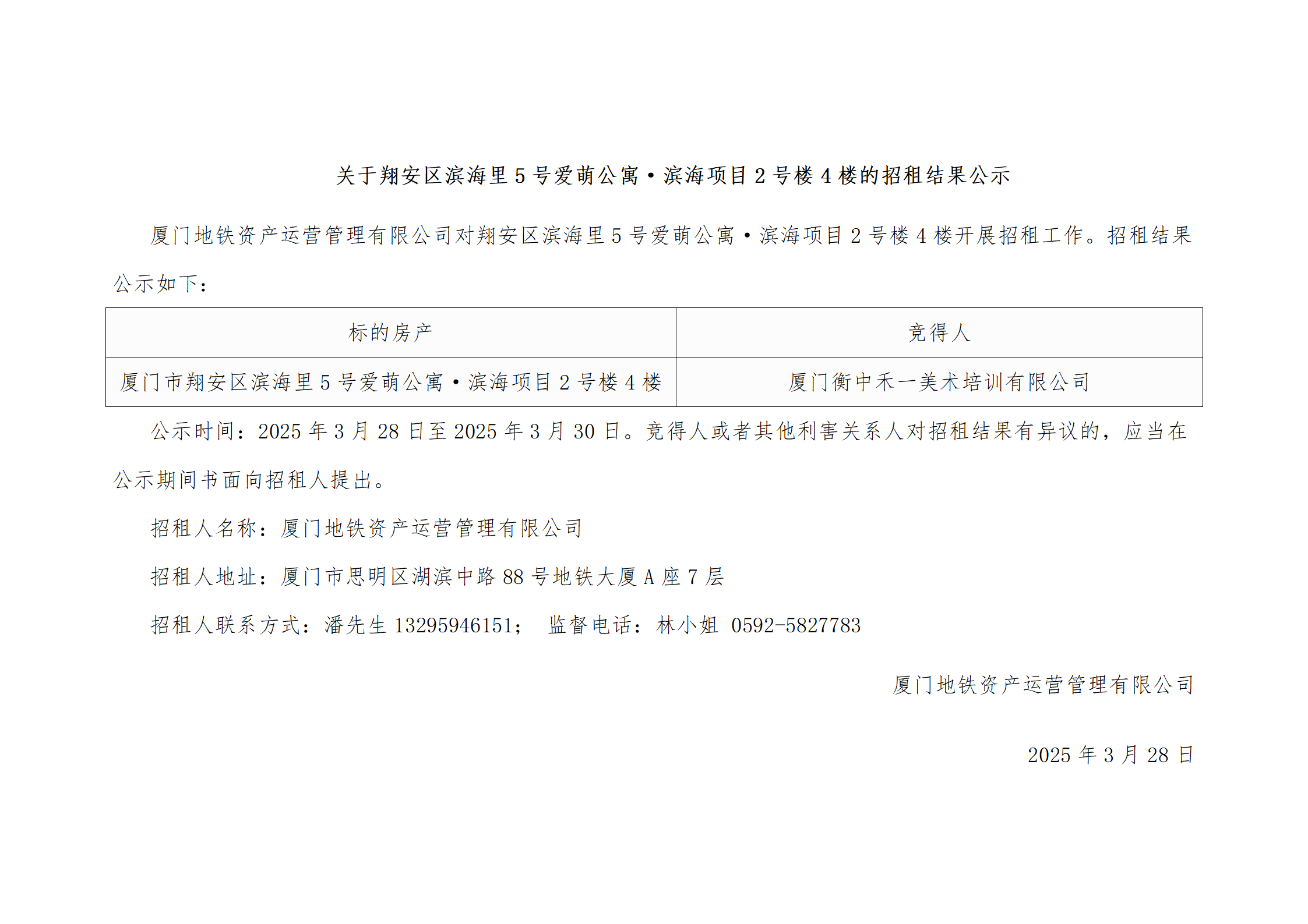 关于翔安区滨海里5号爱萌公寓·滨海项目2号楼4楼的招租结果公示