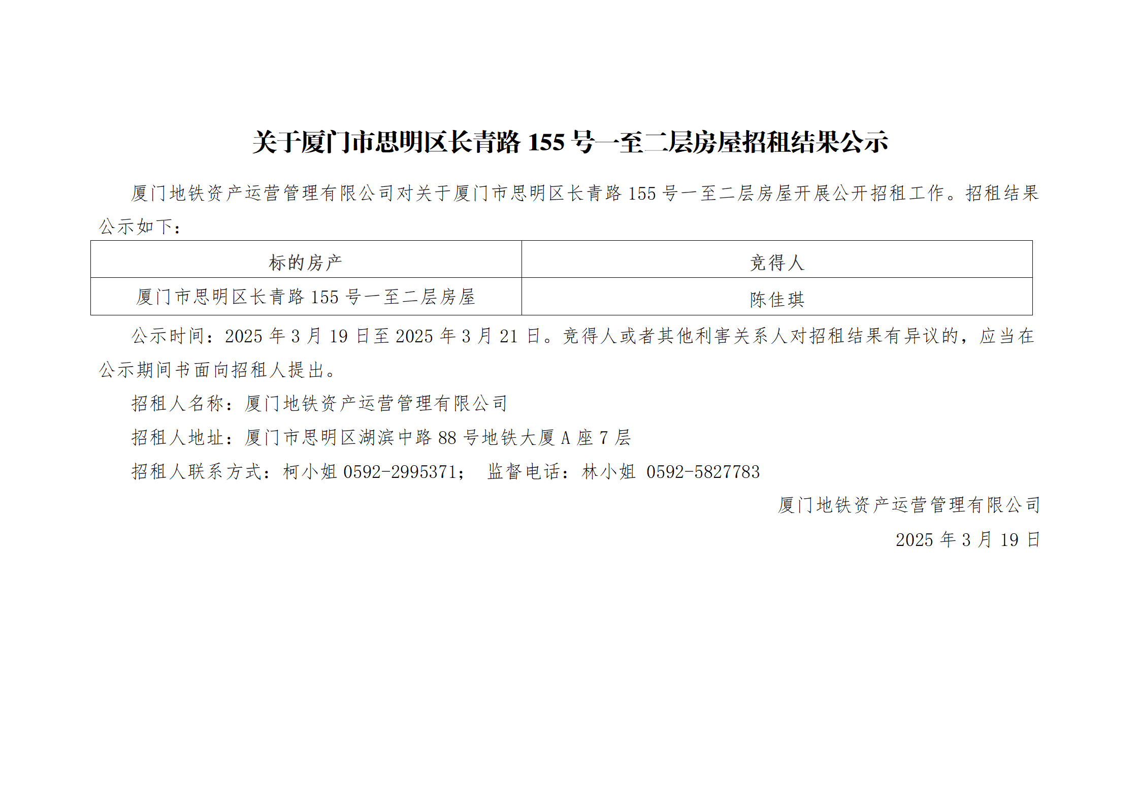 关于厦门市思明区长青路155号一至二层房屋招租结果公示