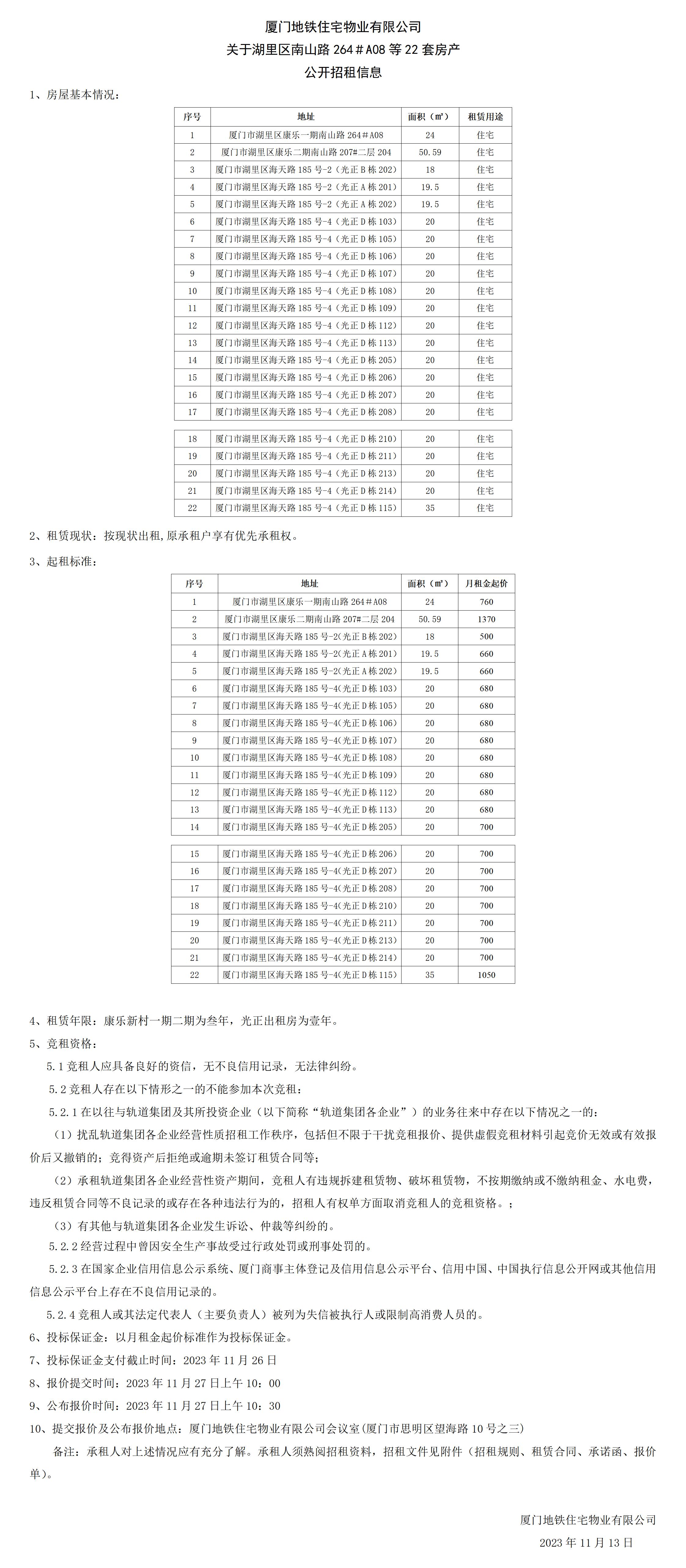 厦门地铁住宅物业有限公司关于湖里区南山路264#A08等22套房产公开招租信息