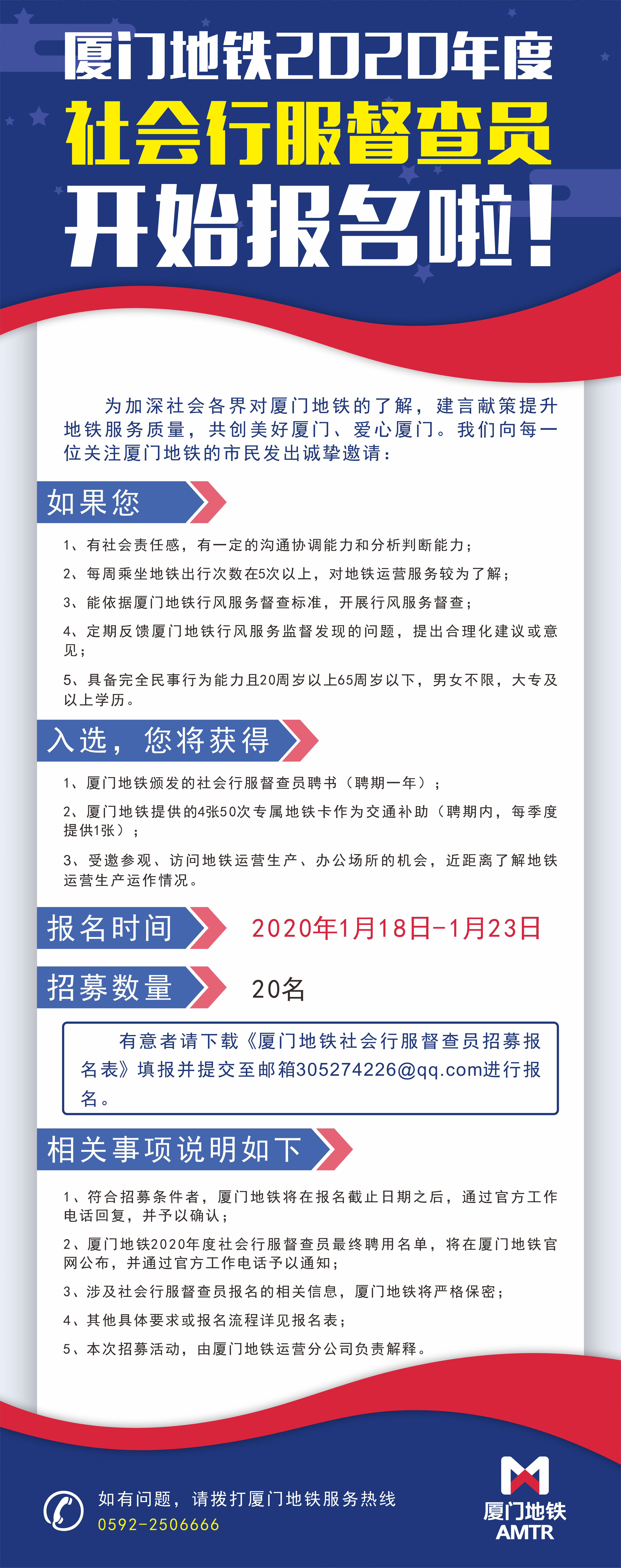 厦门地铁2020年度社会行服督察员开始报名啦!