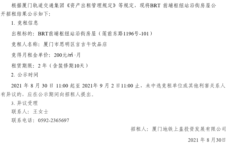 BRT 前埔枢纽站沿街房屋公开招租结果公示