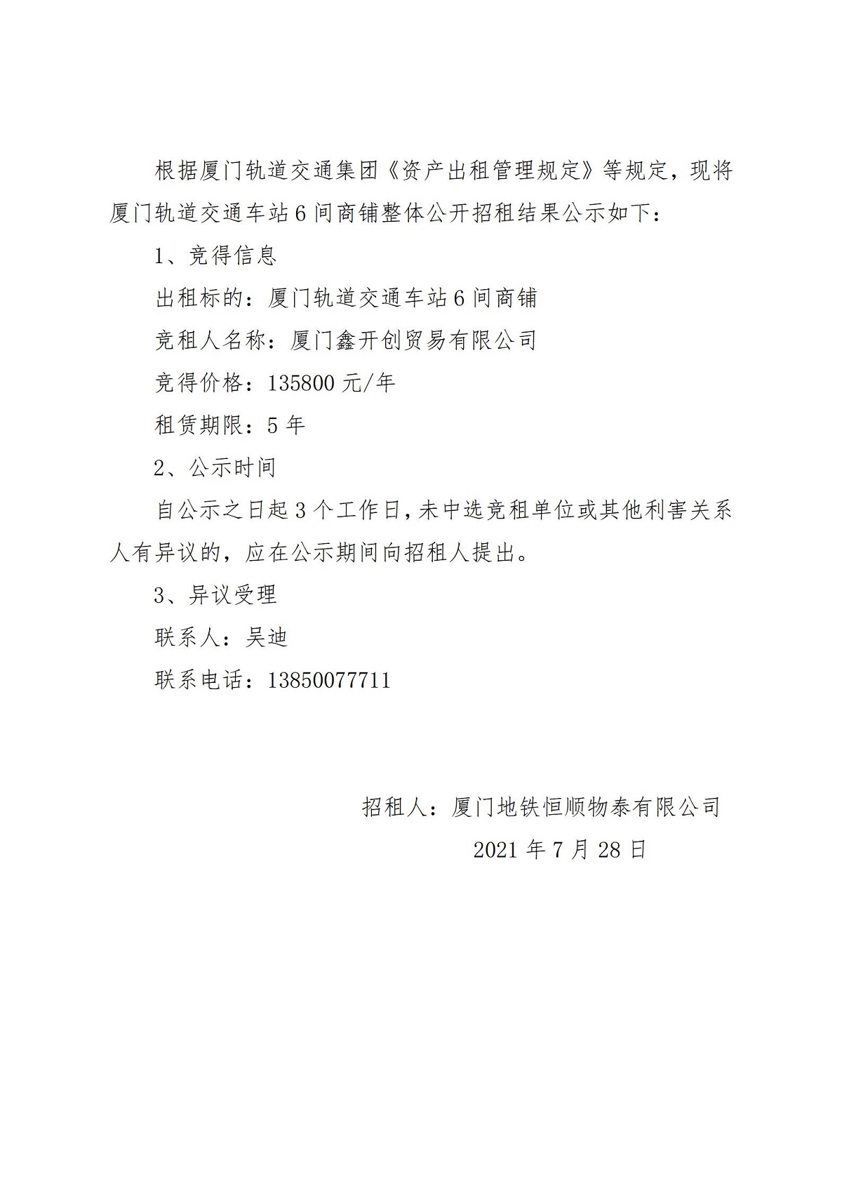 厦门轨道交通车站6间商铺整体公开招租结果公示