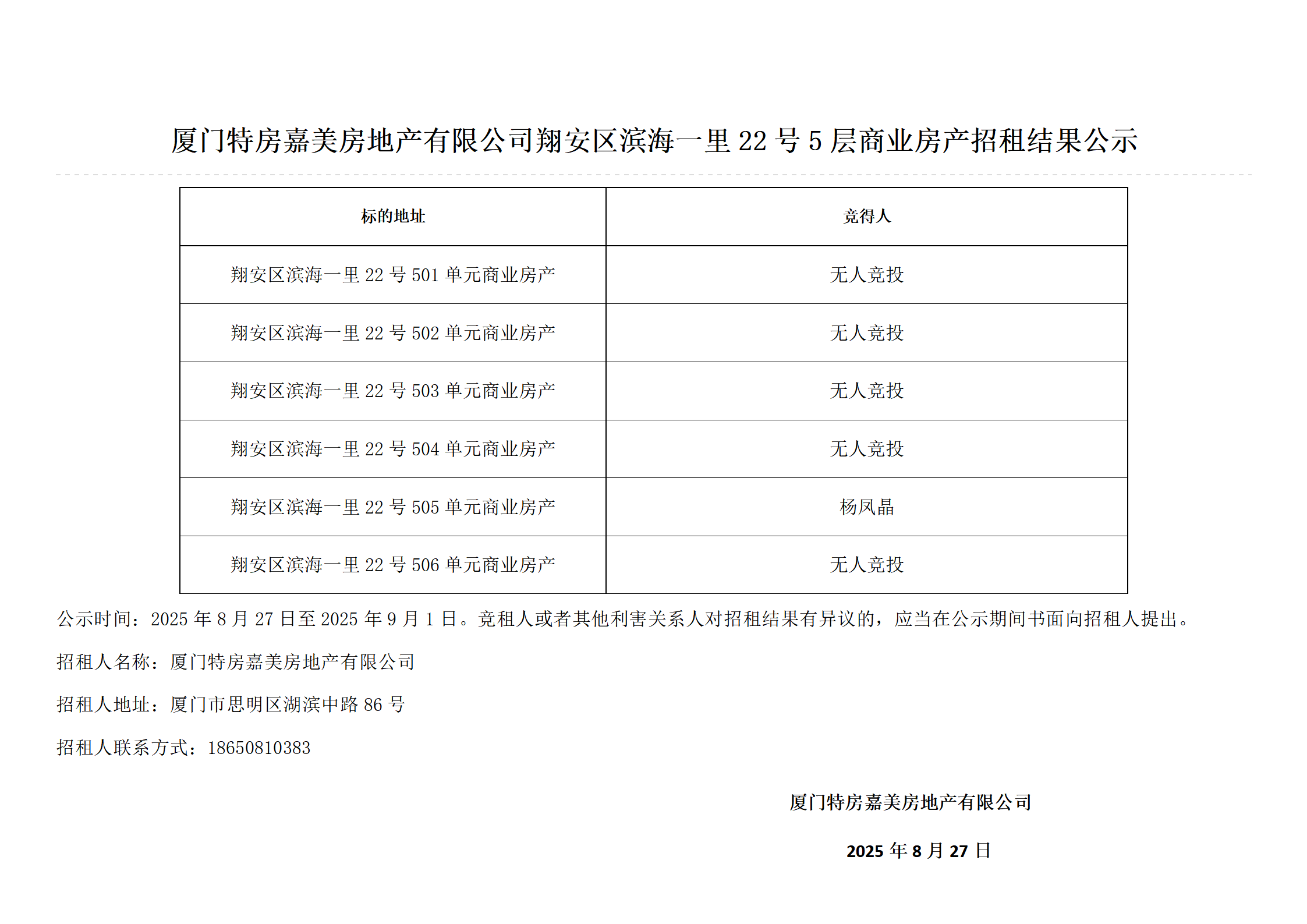厦门特房嘉美房地产有限公司翔安区滨海一里22号5层商业房产招租结果公示