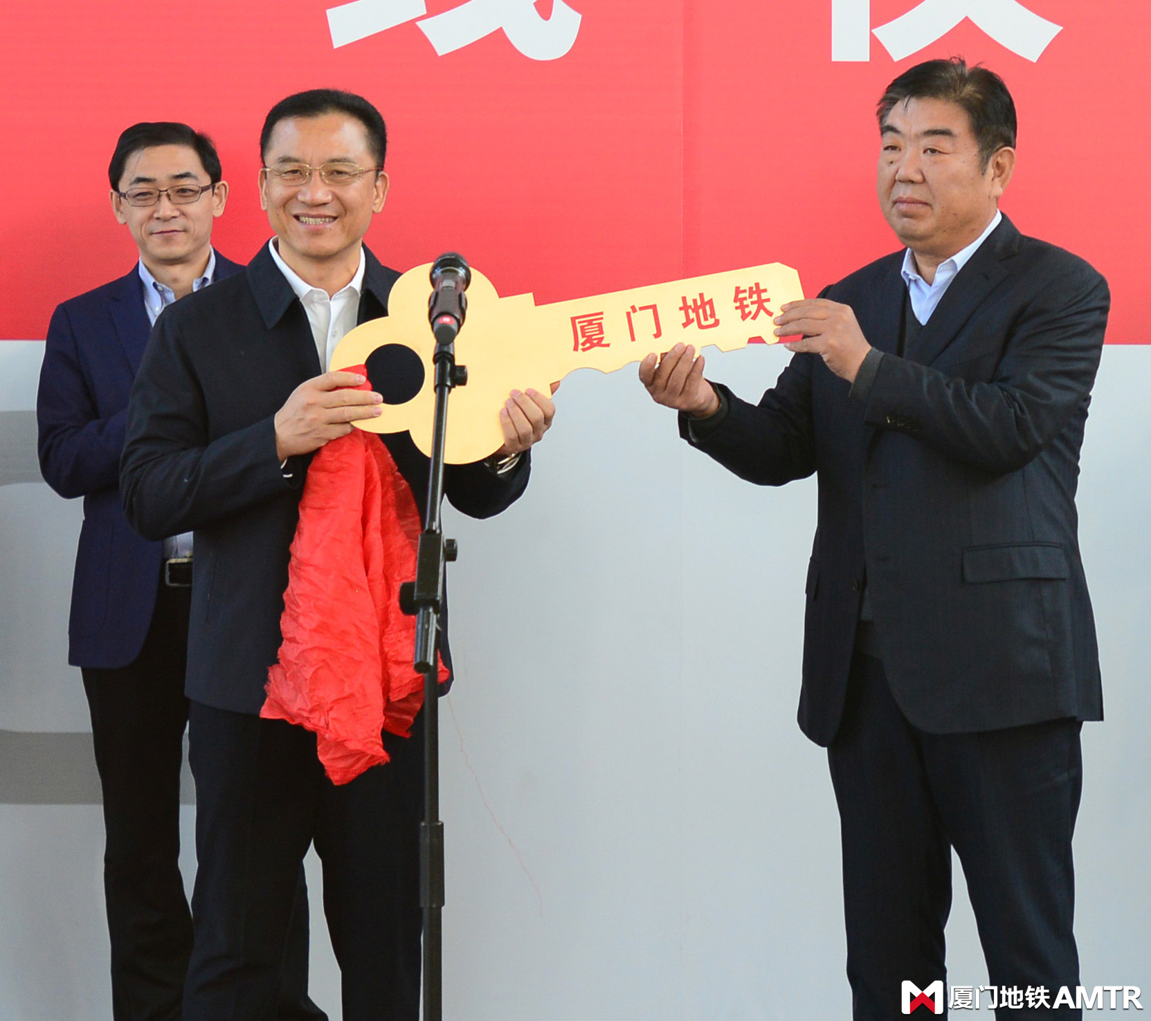 中车长客董事长王润(右)将象征厦门地铁3号线电客车的车辆钥匙递交给厦门轨道交通集团董事长王文格(左)。