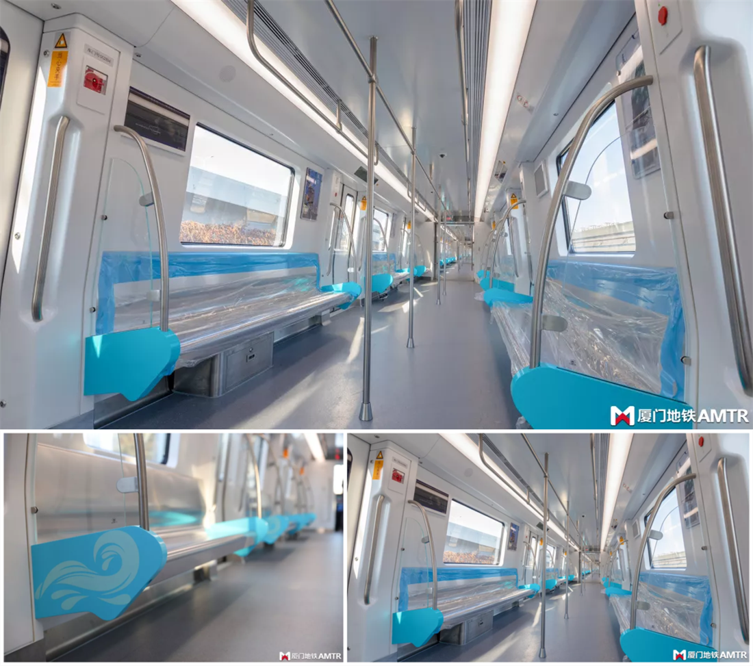 电客车客室内装以3号线线路色,“蓝色”为主配色基调,同时融入了更多的厦门元素,如采用海浪造型的座椅,“厝”顶造型的扶手吊耳等,营造更加温馨的客室环境。