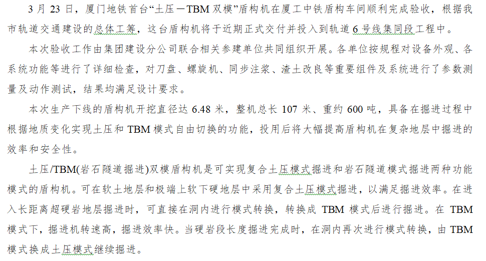 验收通过,厦门地铁首台“土压-TBM双模”盾构机今日下线