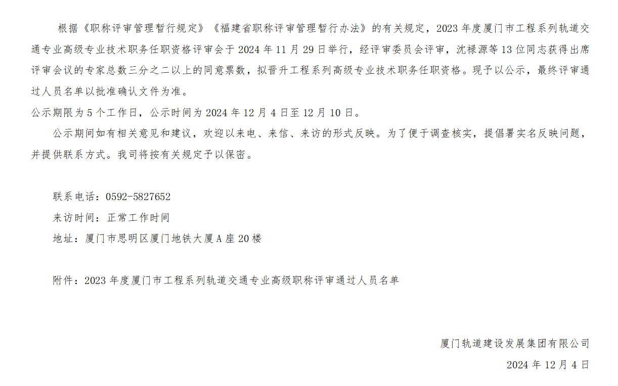 2023年度工程系列轨道交通专业高级专业技术职务任职资格评审通过人员名单公示