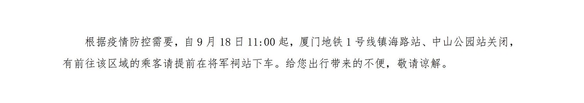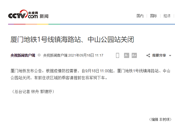 【央视新闻客户端】:厦门地铁1号线镇海路站、中山公园站关闭