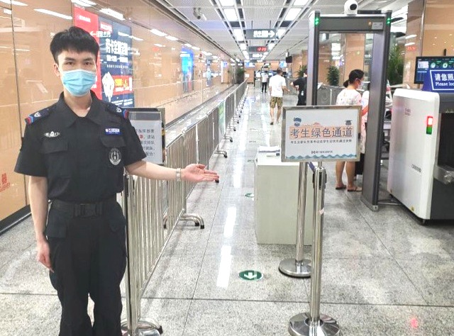 在高考期间为方便考生出行,车站在进出闸机、安检点处设立“考生绿色通道”。考生及家长凭准考证或学生证可优先通过安检。此次高考期间,有近千名考生从绿色通道通过,“考生绿色通道”给他们带来了便利。