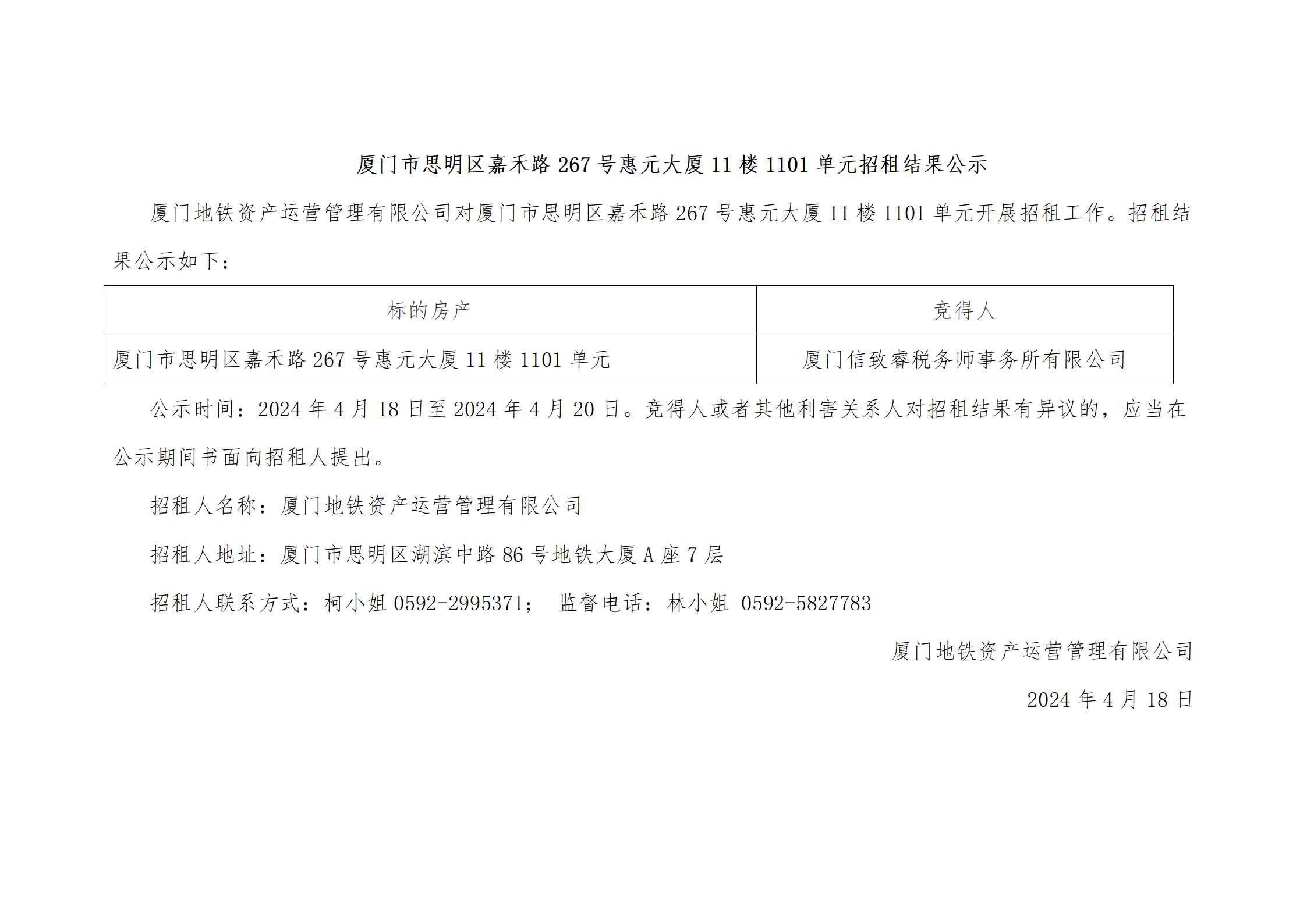 厦门地铁资产运营管理有限公司关于厦门市思明区嘉禾路267号惠元大厦11楼1101单元招租结果公示