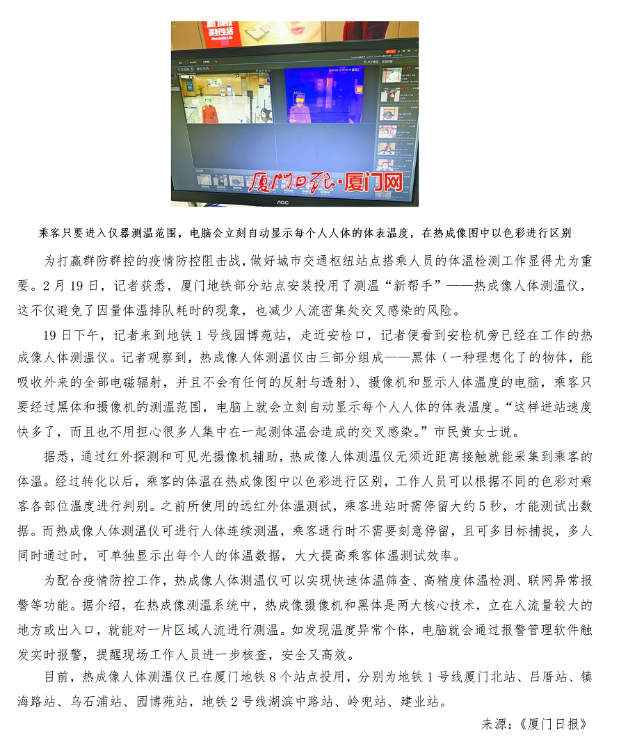 【厦门日报】:厦门地铁8个站点投用热成像人体测温仪,让人群流动更高效