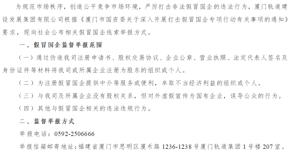 厦门轨道建设发展集团有限公司关于公布打击假冒国有企业专项行动举报方式的公告