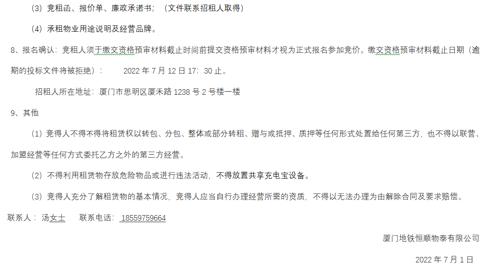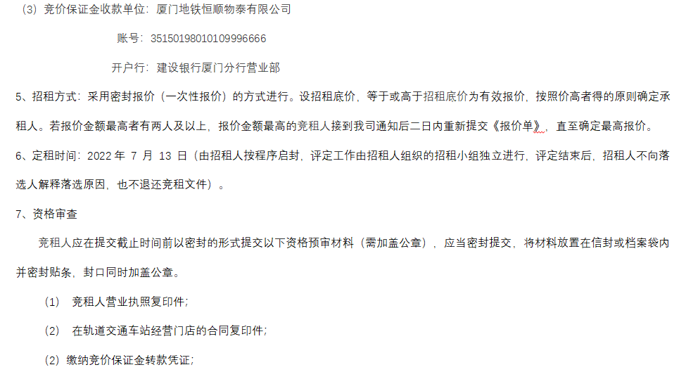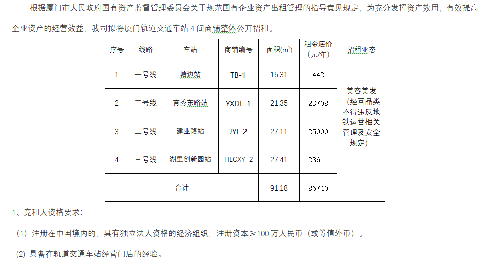 厦门轨道交通车站4间商铺整体公开招租公告