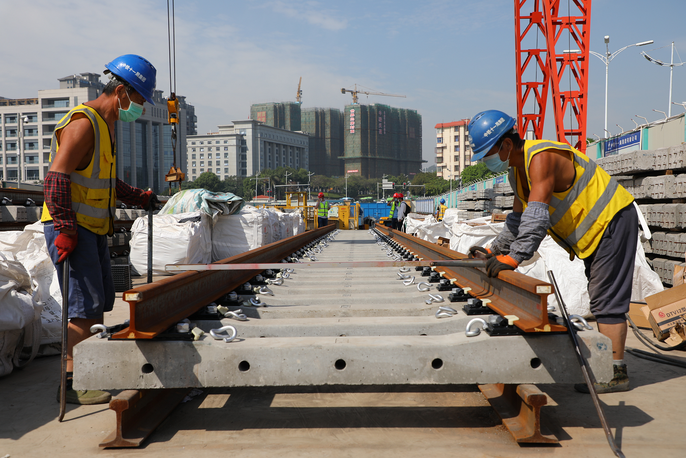 铺轨基地是组装轨排的“临时工厂”,地铁3号线全线共设5个,湖里法院站铺轨基地就是其中之一。在基地现场,数十根混凝土轨枕按照相同的间距,整齐排列在一起,龙门吊将两根钢轨放在轨枕上,工人们调整完轨距后,用扣配件将钢轨和轨枕牢牢锁在一起。