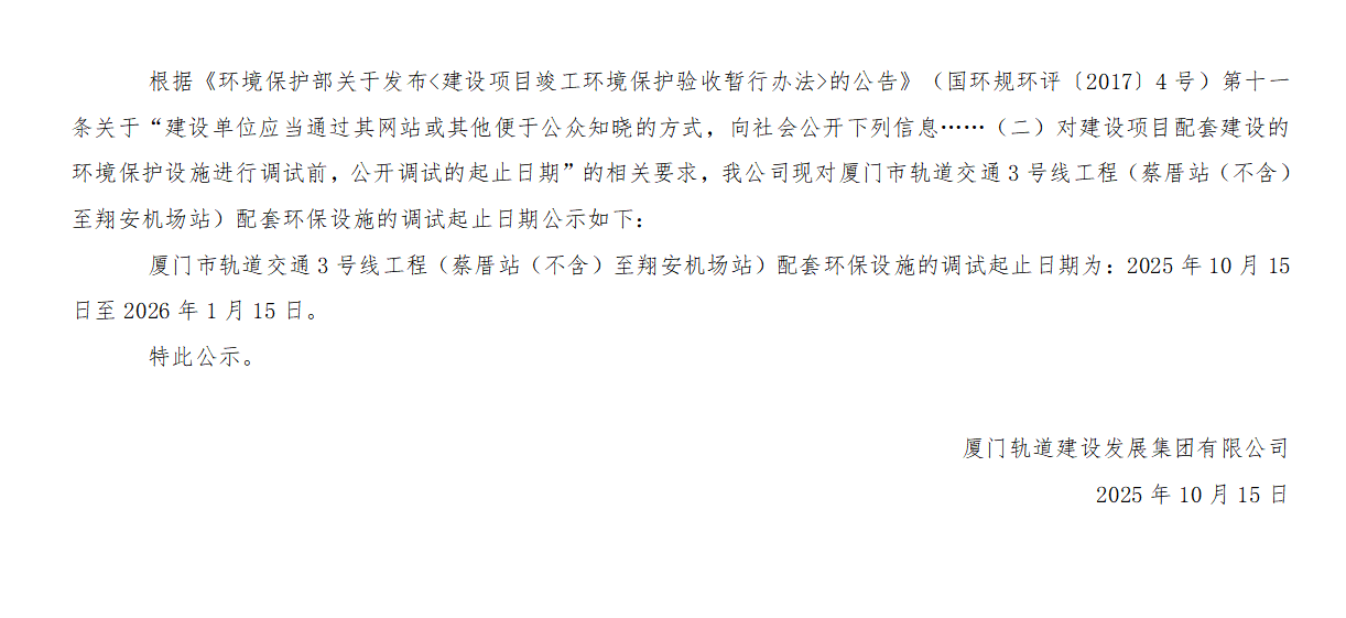 关于厦门市轨道交通3号线工程(蔡厝站(不含)至翔安机场站)环保设施调试起止日期的公示